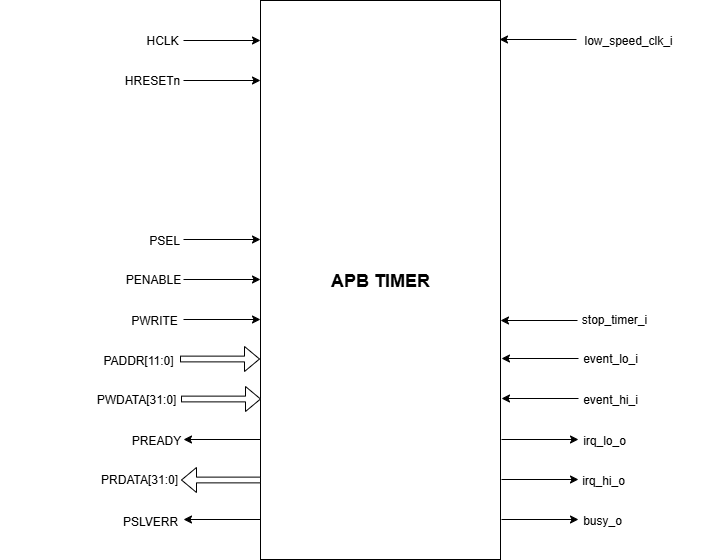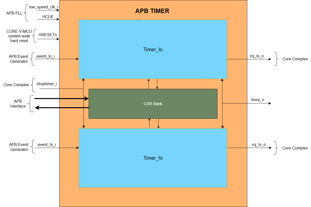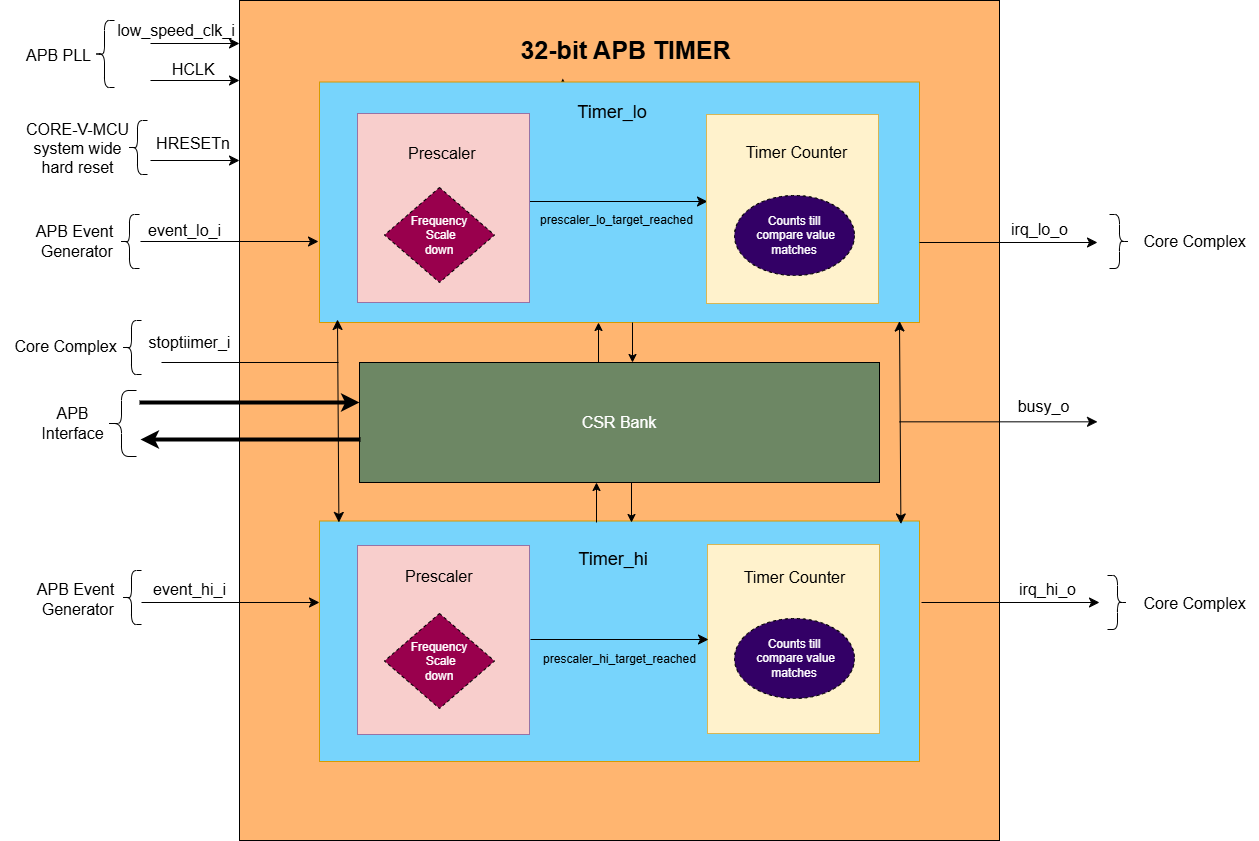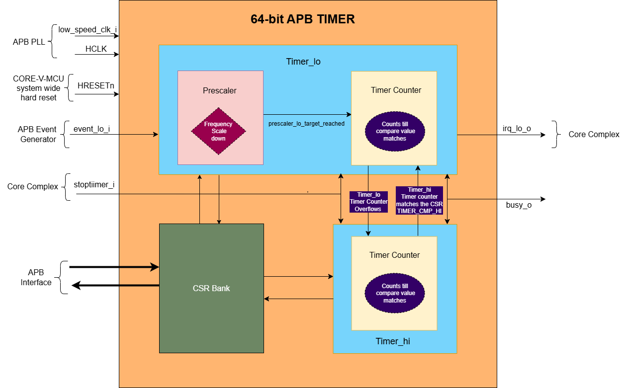 APB timer can either be configured as two 32-bit independent timers or a single 64 bit timer. It has two timers, Timer_hi and Timer_lo which are responsible to generate irq_lo_o or irq_hi_o interrupt signals to Core Complex/CPU. Working of Timer_lo and Timer_hi is functionally identical in the 32 bit mode, whereas Timer_lo and Timer_hi are cascaded in 64 bit mode. The APB timer can be configured using CSRs. The CSRs of the APB timer are accessible using the APB bus.