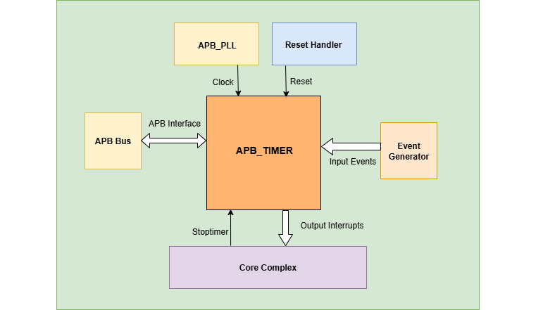 APB Timer generates interrupts to the Core complex or CPU subsystem with a finite configurable delay. It manages the interrupt generation through various configurations of prescaler, reference clock and timer counters.