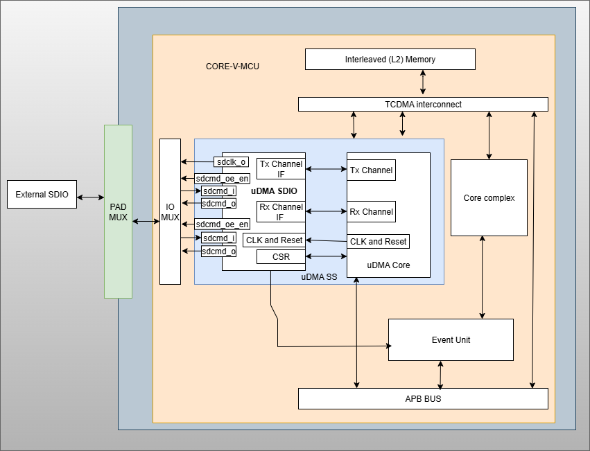 uDMA SDIO uses the Tx channel interface to read the data from the interleaved (L2) memory via the uDMA Core. It transmits the read data to the external SDIO device. uDMA SDIO uses the Rx channel interface to store the data received from the external SDIO device to the interleaved (L2) memory. Refer to uDMA subsystem for more information about the Tx and Rx channel functionality of uDMA Core.