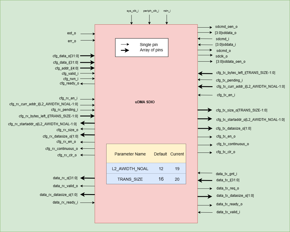 uDMA SDIO uses the following pins to share the value of config CSRs, i.e., TX_SADDR, TX_SIZE, and TX_CFG, with the uDMA core: -