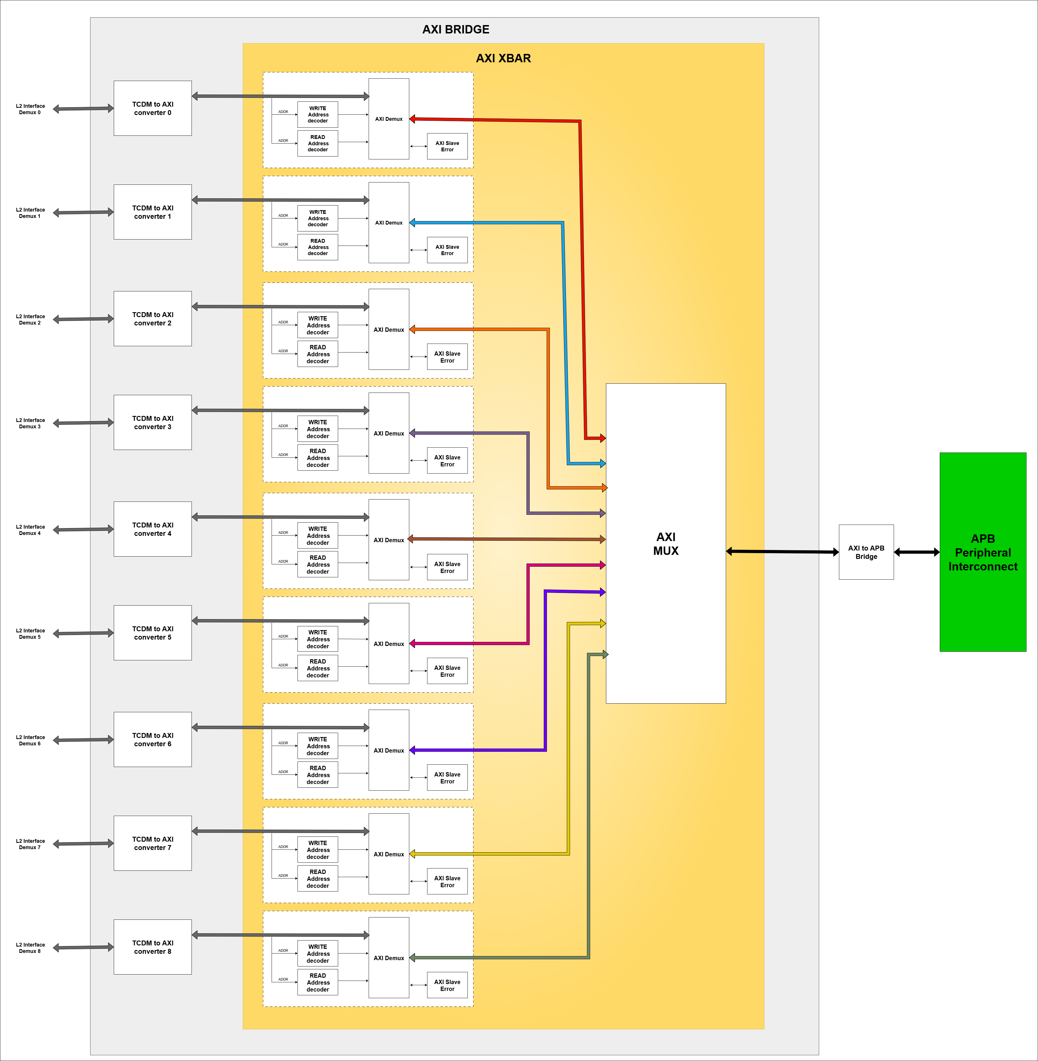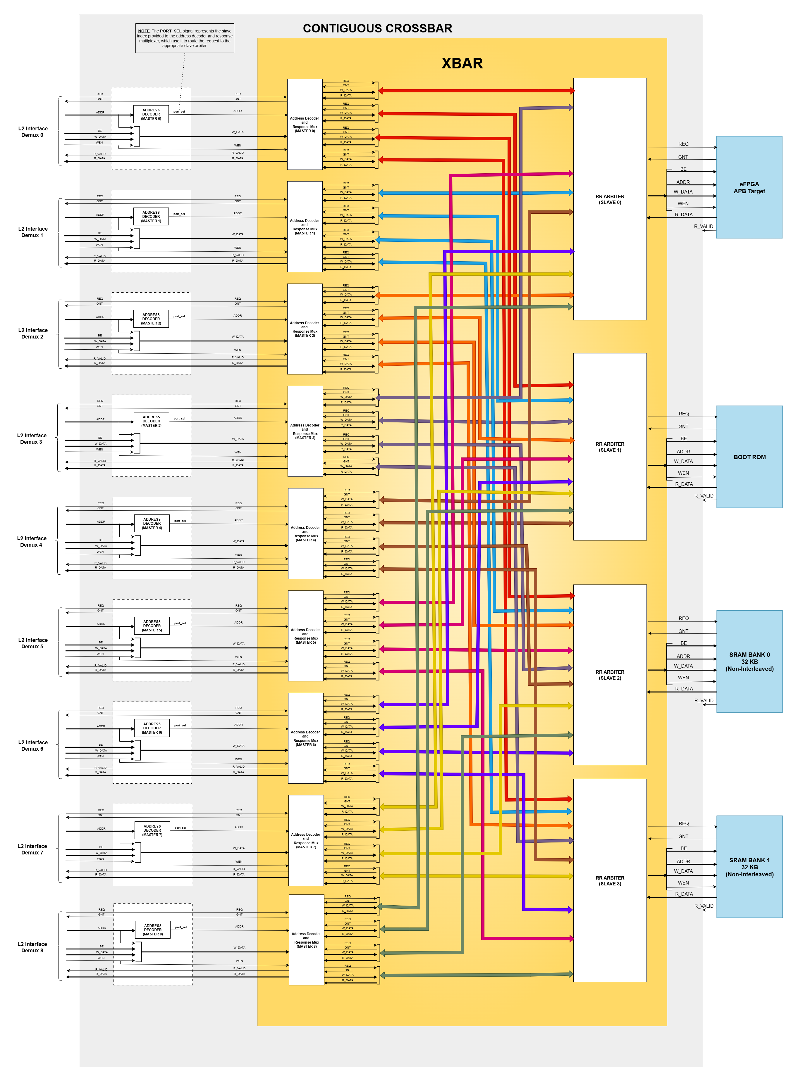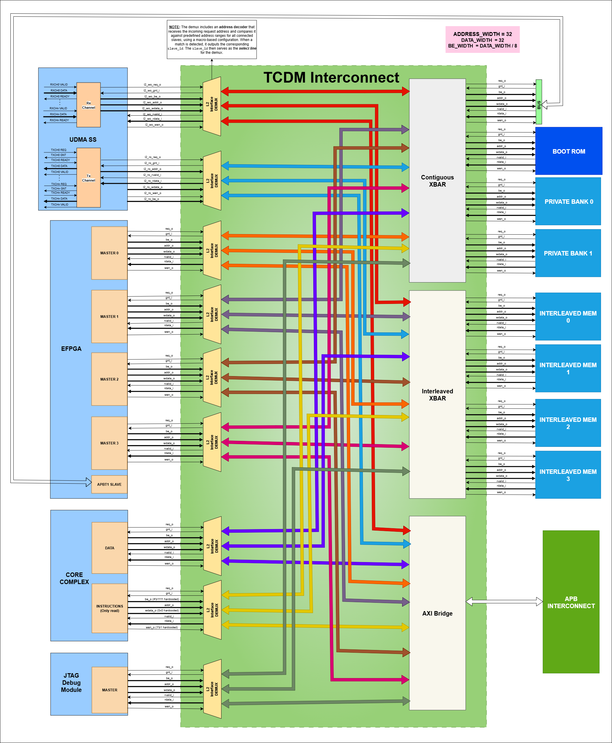 The L2 Interconnect Demux identifies the target slave region and routes the request to appropriate destination - either one of the Crossbars or the AXI Bridge. Internally, both the Crossbars and the AXI Bridge use address decoders and arbiters to direct requests to the correct slave.
